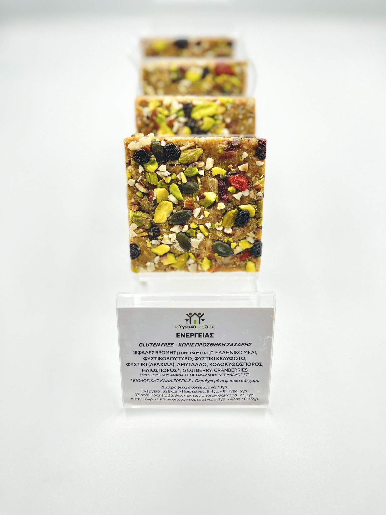 Συστατικά: Ελληνικό μέλι, βρώμη ,φυστικοβούτυρο, αμύγδαλο, φυστίκι, ηλιόσπορος, κολοκυθόσπορο, goji berry, cranberries, αράπικο φυστίκι.