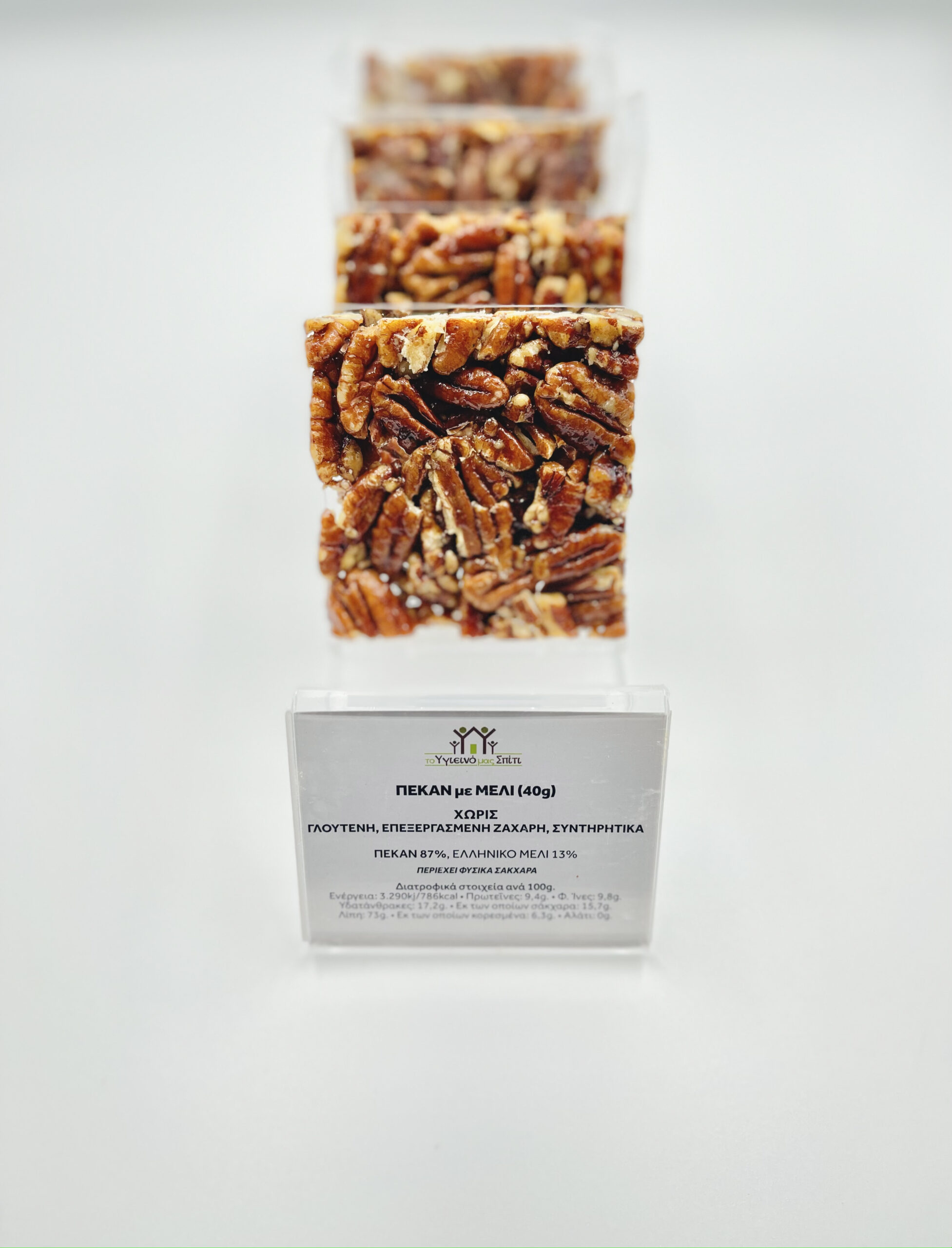 Συστατικά: Πεκάν 87%, Ελληνικό Μέλι 13% Διατροφικά στοιχεία ανά 100g. Ενέργεια: 3.290kj/786kcal, Λιπαρά: 73g. • Εκ των οποίων κορεσμένα: 6,3g,• Υδατάνθρακες:17,2g • Εκ των οποίων σάκχαρα: 15,7g.,• Εδώδιμες ίνες :9,8g.• Πρωτεΐνες:9,4g. • Αλάτι: 0g