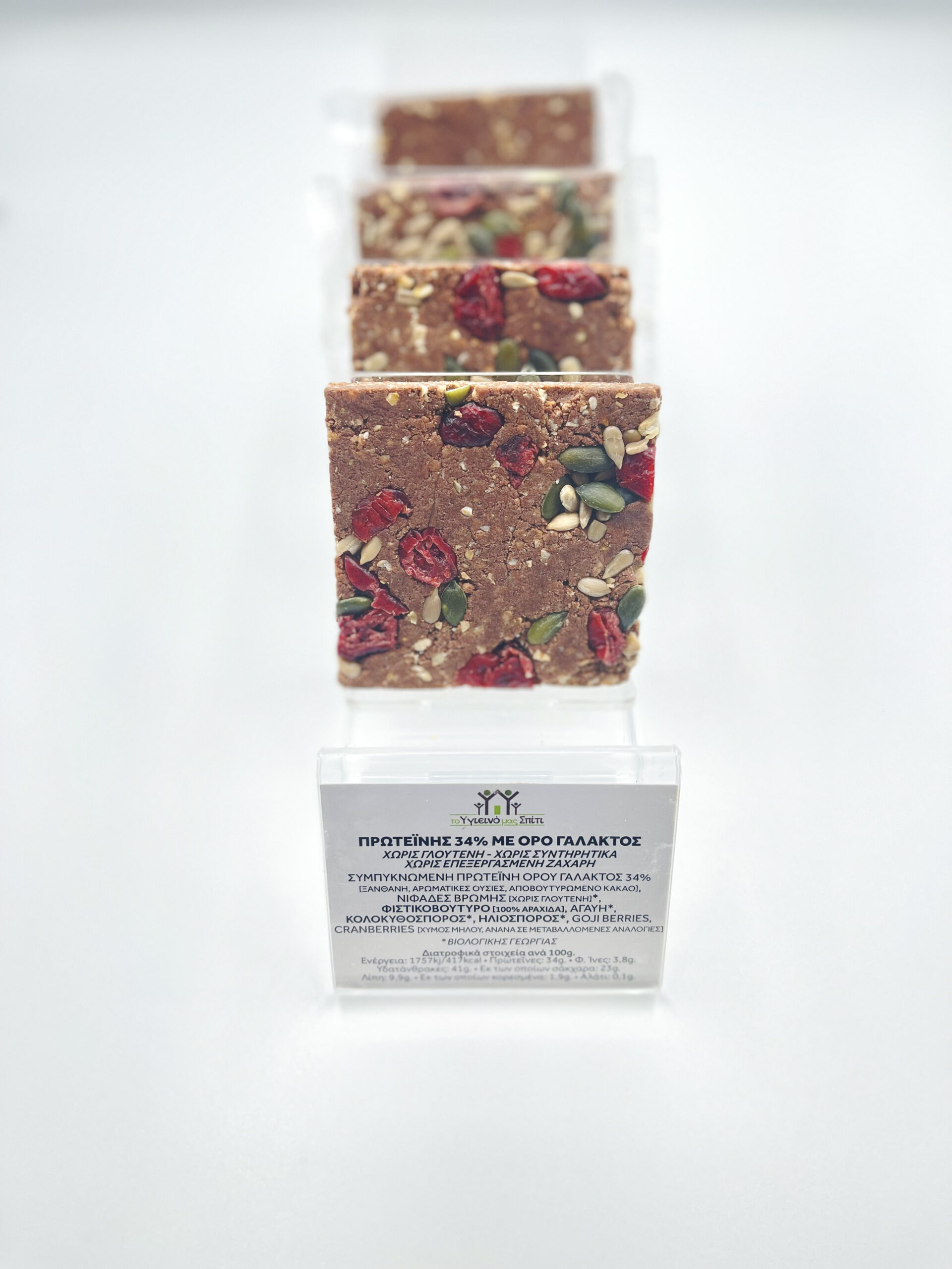 Συστατικά: ΠΡΩΤΕΙΝΗ ΟΡΟΣ ΓΑΛΑΚΤΟΣ 34% (Αποβουτυρωμένο ΓΑΛΑ, Ξανθάνη, Αρωματικές ύλες: βανίλια, λευκή σοκολάτα),Νιφάδες βρώμης*[χωρίς γλουτένη],Αγαύη*,ΦΥΣΤΙΚΟΒΟΥΤΥΡΟ (100% ΑΡΑΧΙΔΑ),Ηλιόσπορος*,Κολοκυθόσπορος*,Κράνμεπρι [Χυμός μήλου η ανανά σε μεταβαλλόμενες αναλογίες].*ΒΙΟΛΟΓΙΚΗΣ ΓΕΩΡΓΙΑΣ. Διατροφικά στοιχεία ανά 100g. Ενέργεια: 1728kj/410kcal • Λιπαρά: 9,8g. • Εκ των οποίων κορεσμένα: 1,7g • Υδατάνθρακες: 41g. • Εκ των οποίων σάκχαρα: 23g • .Εδώδιμες ίνες: 3,4g.• Πρωτεΐνες: 34g . • Αλάτι: 0,1g