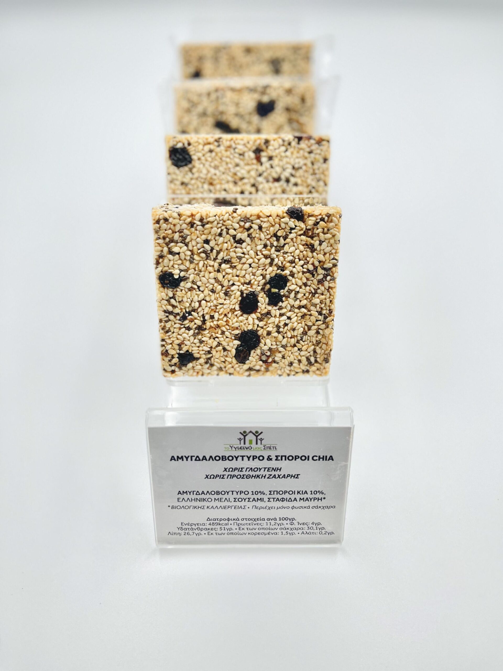 Οι μπάρες με Σουσάμι, Aμυγδαλοβούτυρο και Σπόρους Chia δημιουργούνται χωρίς προσθήκη ζάχαρης και συντηρητικών, αλλά αγνό Ελληνικό Μέλι.