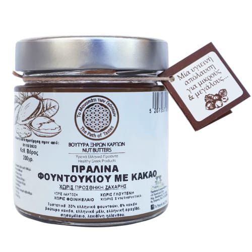 Μπορεί να έχουμε συνδυάσει στο μυαλό μας με το γλυκό το ανθυγιεινό, αλλά η συγκεκριμένη πραλίνα φουντουκιού έρχεται να μας ανατρέψει αυτό το στερεότυπο!! Η περιεκτικότητα της σε φουντούκια ανέρχεται στο 33%, ενώ η γλυκιά της γεύση δεν οφείλεται στη ζάχαρη αλλά σε 100% ελληνικό μέλι και κακάο. Αποτελείται από αγνά και κυρίως ποιοτικά συστατικά και μπορούν να την απολαύσουν μεγάλοι και μικροί σε όλες τις στιγμές της ημέρας. Ακόμη, θα πρέπει να σημειωθεί ότι τα φουντούκια είναι πλούσια σε ίνες, βιταμίνες και λιπαρά οξέα που βοηθούν σημαντικά στην εύρυθμη λειτουργία του οργανισμού.